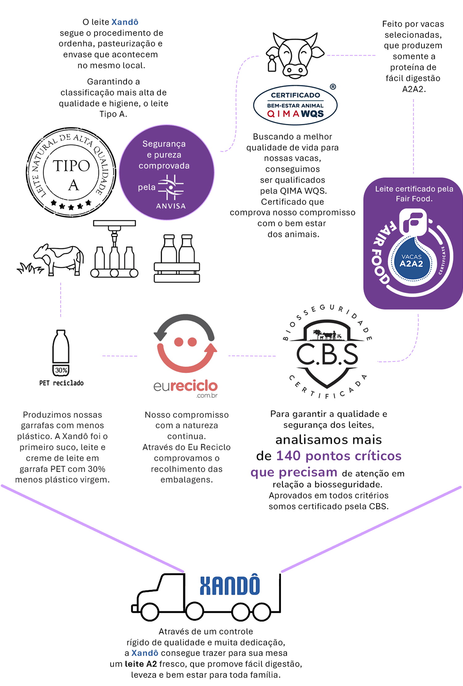 Importante: o leite A2A2 é indicado para pessoas com sensibilidade ao leite convencional. Para intolerantes a lactose, recomendamos Leite Tipo A Zero Lactose Xandô A2.